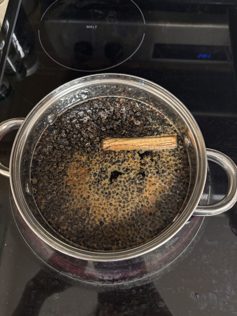Simmered elderberries with cinnamon, cloves, ginger, and raw honey to create a deeply nourishing syrup