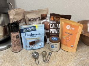 Cacao Powder, Mushroom Powder Blend, Blue Lotus Chai Tea, Ceylon Cinnamon, Red Maca Root Powder, Turmeric Powder, And Frother.